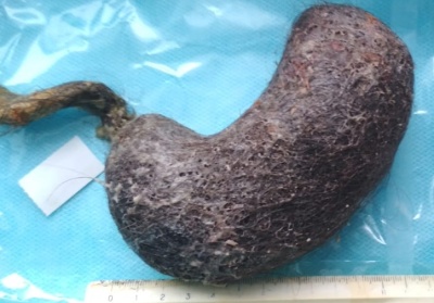 Из просвета желудка удален трихобезоар размерами 20x5x4 см с длинным до 35 см «хвостом», который уходил в тонкую кишку (синдром Рапунцель).