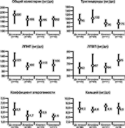Исследования проводили до начала лечения и на фоне ЗГТ препаратами эстрофем1, клиогест2 и трисеквенс3(фирма «Ново Нордиск», Дания). Комбинированный препарат (клиогест) применяли у женщин, оперированных по поводу эндометриоза, во избежание рецидива эндометриоза под влиянием препаратов, содержащих только эстрадиол. Клиогест и трисеквенс получали женщины, оперированные по поводу миомы матки и доброкачественных образований яичников. Причем, эстрофем назначали женщинам более молодого возраста – до 45 лет. Т.о., ЗГТ получали 101 пациентка из 170 обследованных, у остальных были противопоказания для применения гормональных препаратов; несколько женщин отказались от ЗГТ по тем или иным причинам.