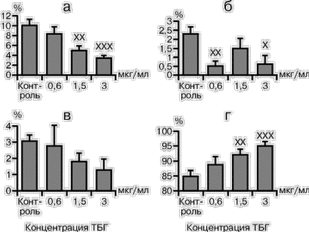 Препарат ПАМГ-2 не оказывал влияния на функциональную активность перитонеальных макрофагов. Обсуждение Таким образом, проведенные нами исследования свидетельствуют о том, что в динамике менструального цикла отсутствуют различия показателей специфических плацентарных белков. Перитонеальная жидкость здоровых женщин в среднем содержит 6,45 нг/мл ТБГ, 36,72 нг/мл ПАМГ-2. У фертильных женщин с наличием наружного генитального эндометриоза не выявлено достоверных различий этих показателей по сравнению с контрольной группой. У женщин с бесплодием, обусловленным наружным генитальным эндометриозом, в сравнении с контрольной группой обнаружено увеличение концентрации ТБГ в целом и в динамике менструального цикла. Следует отметить, что информативность исследования концентрации плацентарных белков в перитонеальной жидкости различается в разные фазы менструального цикла. Так, концентрация ПАМГ-2 у женщин с бесплодием, обусловленным наружным генитальным эндометриозом, повышена в сравнении со здоровыми женщинами только в I фазе менструального цикла. Учитывая данные о способности ПАМГ-2 нарушать взаимодействие сперматозоидов и яйцеклетки [16, 17], можно предположить участие этого механизма в развитии бесплодия при эндометриозе. При прогрессировании заболевания происходит повышение содержания ТБГ в перитонеальной жидкости. Это увеличение более значительно при III и IV степени заболевания. На последних стадиях заболевания информативным является и повышенное содержание ПАМГ-2. Показатели специфических плацентарных белков в перитонеальной жидкости при изученных формах бесплодия имеют определенную прогностическую значимость. Так, в группе женщин с бесплодием, обусловленным наружным генитальным эндометриозом, вероятность наступления беременности тем выше, чем больше средняя концентрация ТБГ в перитонеальной жидкости. В наших исследованиях обнаружено прямое ингибирующее действие ТБГ на фагоцитарную активность перитонеальных макрофагов в отношении гетерологичных сперматозоидов in vitro. С учетом этого можно предположить, что увеличение концентрации ТБГ в перитонеальной жидкости является одним из механизмов ингибирования фагоцитоза гетерологичных сперматозоидов перитонеальными макрофагами in vivo. Таким образом, представленные данные свидетельствуют о высокой информативности исследования содержания специфических плацентарных белков в перитонеальной жидкости и обосновывают целесообразность использования препарата ТБГ с целью подавления фагоцитоза сперматозоидов в комплексной терапии нарушения репродуктивной функции женщин. Л.В. Посисеева, А.О. Назарова Кафедра акушерства и гинекологии Ивановской государственной медицинской академии; Ивановский НИИ материнства и детства им. В.Н. Городкова Минздрава Российской Федерации Литература 1. Татаринов Ю.С., Масюкевич В.Н. Иммунохимическая идентификация нового бета-1-глобулина в сыворотке крови беременных женщин. Бюлл экспер биол 1970; 6: 66. 2. Александров Л.С., Размахина Н.И., Побединский Н.М., Платонова Т.К. Содержание трофобластического бета-гликопротеина в сыворотке крови при нормальной беременности и нефропатии. Акуш и гинек 1994; 2: 47–48. 3. Александров Л.С. Особенности динамики содержания трофобластического b-гликопротеина в сыворотке крови беременных при физиологической беремен