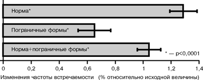 При анализе изменения доли различных морфологических типов сперматозоидов в результате выделения фракции прогрессивно подвижных клеток было выявлено значительное повышение доли нормальных и пограничных (с легкой формой патологии) сперматозоидов в подвижной фракции по сравнению с нативным эякулятом (43,1±2,1 и 21,6±1,5 p меньше 0,0001; 12,6±0,4 и 9,3±0,5 p меньше 0,0001 соответственно) (табл. 1). Относительный прирост частоты встречаемости нормальных сперматозоидов составил в среднем 128,8±9,7%, доли пограничных клеток 65,0±11,6%, а суммарной доли нормальных и пограничных форм – 104,4±8,3% (рис. 2).