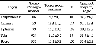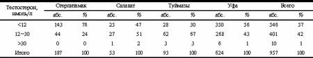 Определение базального уровня тестостерона у мужчин в индустриальных городах РБ выявило ряд закономерностей, главной из которых является выраженная тенденция к гипоандрогенемии как во всей совокупности, так и в отдельных группах обследованных пациентов в различных городах (табл. 1). Наиболее низкий уровень тестостерона у мужчин обнаружен в Стерлитамаке и Уфе, где он статистически значимо отличался от средних сывороточных концентраций у пациентов, проживающих в Туймазах и Салавате. Анализ полученных данных свидетельствует о том, что снижение содержания тестостерона носит не относительный, а преимущественно абсолютный характер. В табл. 2 представлено распределение обследованных мужчин по отношению концентрации тестостерона к референтным пределам его уровня, указанным в инструкциях, прилагаемым к тест-системам. Для большинства обследованных лиц (57%) характерен абсолютный андрогенный дефицит, т.е. уровень общего тестостерона в сыворотке крови ниже 12 нмоль/л. Степень абсолютной андрогенной недостаточности колеблется от 30% в относительно благополучных Туймазах до 76% в Стерлитамаке. Сопоставление этих данных с результатами известного исследования A. Vermeulen [9], обнаружившего признаки абсолютного андрогенного дефицита лишь у 1% здоровых мужчин данной возрастной группы (20-40 лет), одных районов, где расположены предприятия нефтепереработки и нефтехимии, статистически значимо ниже, чем у мужского населения более отдаленных южных районов (табл. 3). В противоположность этому, сывороточный уровень эстрадиола превышал показатели нормы как в среднем по городу, так и в группе мужчин, проживающих в районах, подверженных значительной техногенной нагрузке, что может свидетельствовать о демаскулинизирующей и феминизирующей направленности процессов перестройки эндокринной регуляции репродукции в условиях экологического напряжения. Таблица 2. Распределение мужчин по отношению концентрации тестостерона к референтным границам